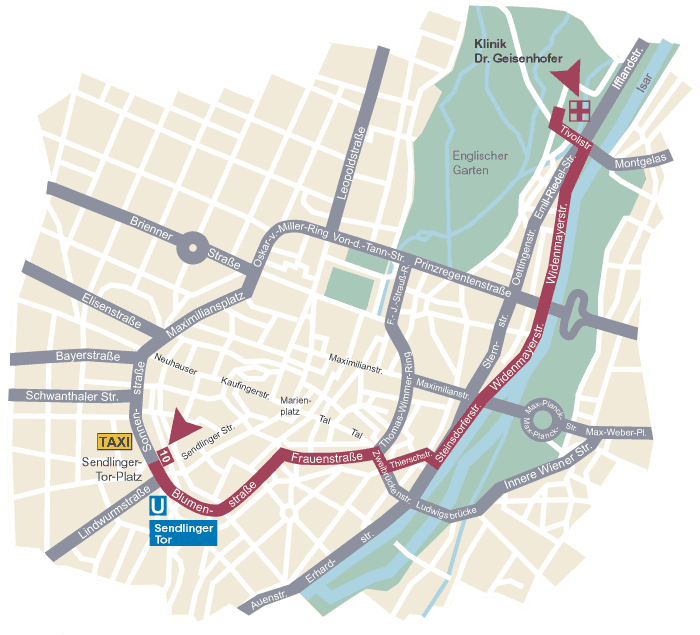 Über den Altstadtring bis zur Isar, auf die Widenmayerstraße und dann über die Tivolibrücke oder vom Mittleren Ring kommend auf die Ifflandstraße, vorbei am Park Hilton Hotel.